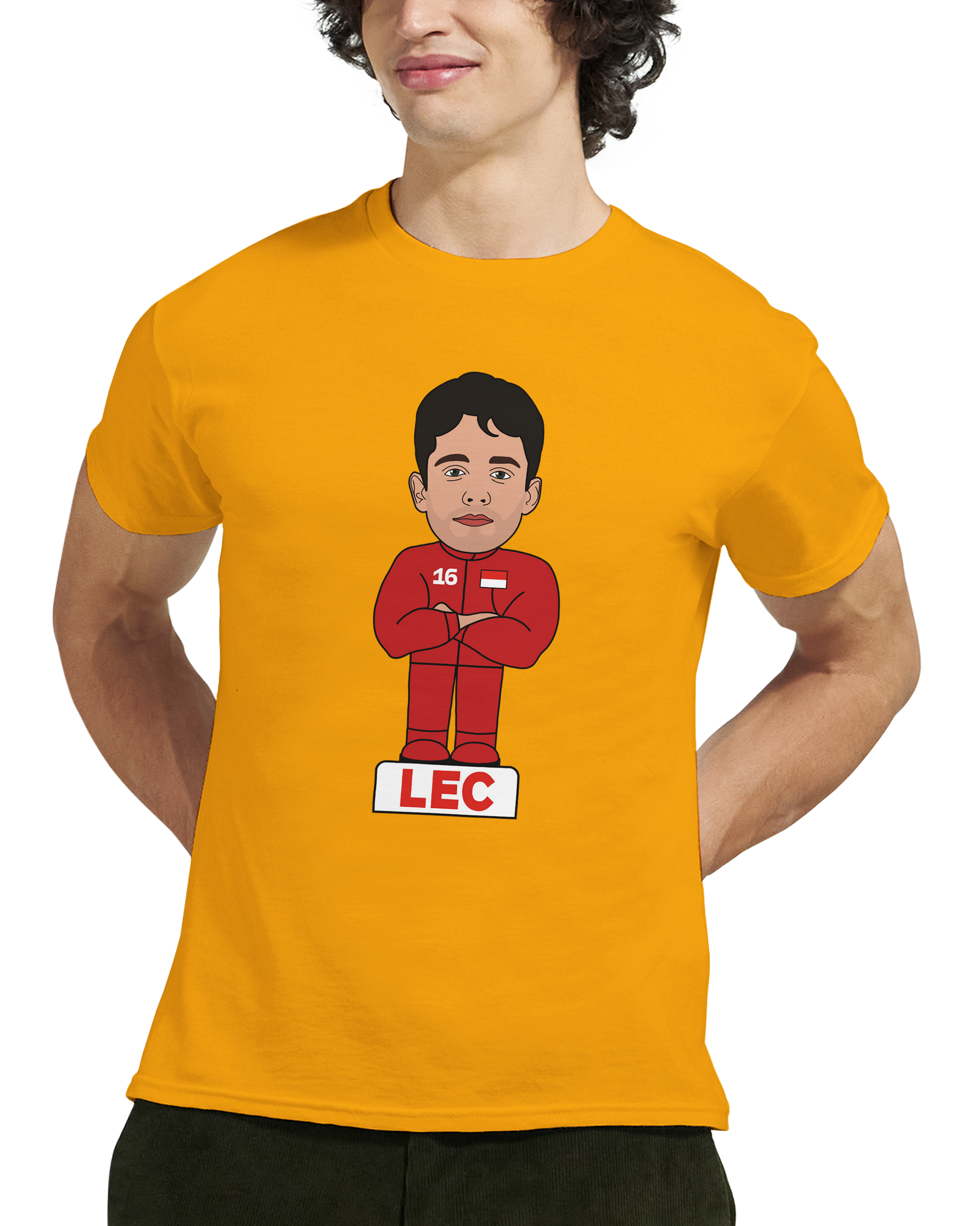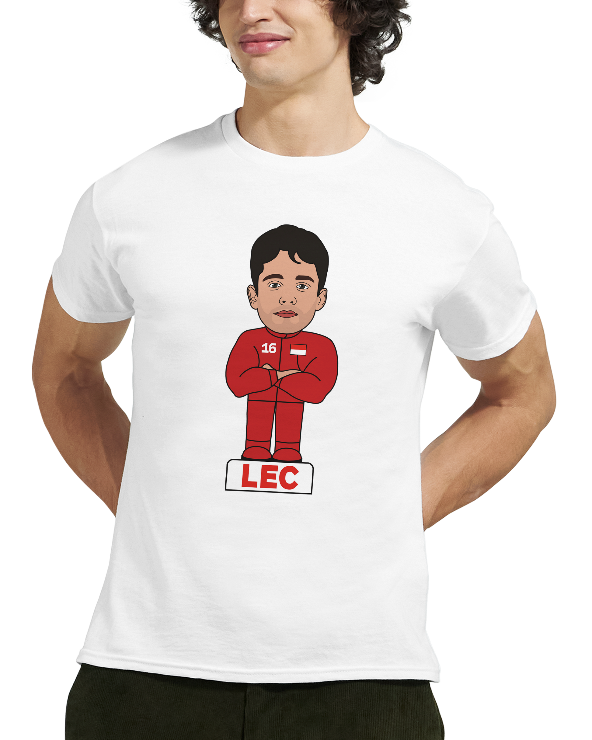 🏎️ A fun cartoon Charles Leclerc Formula 1 T-Shirt featuring his name icon and number.