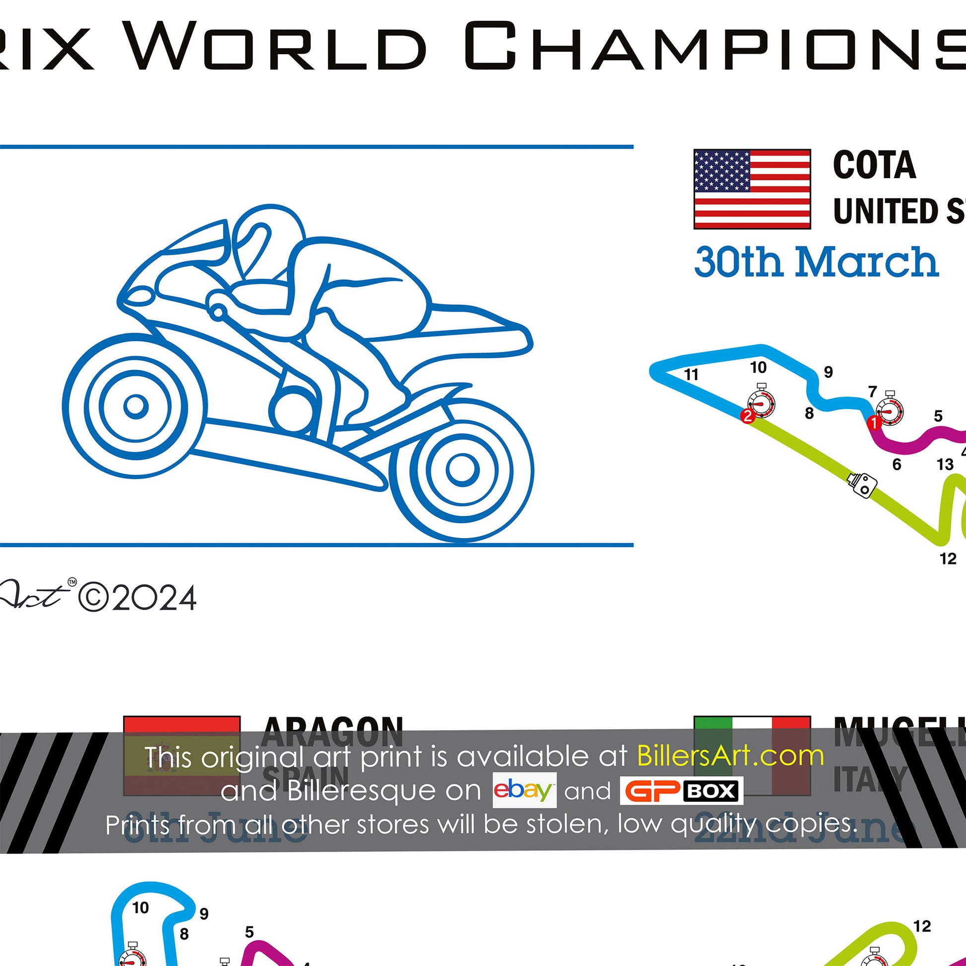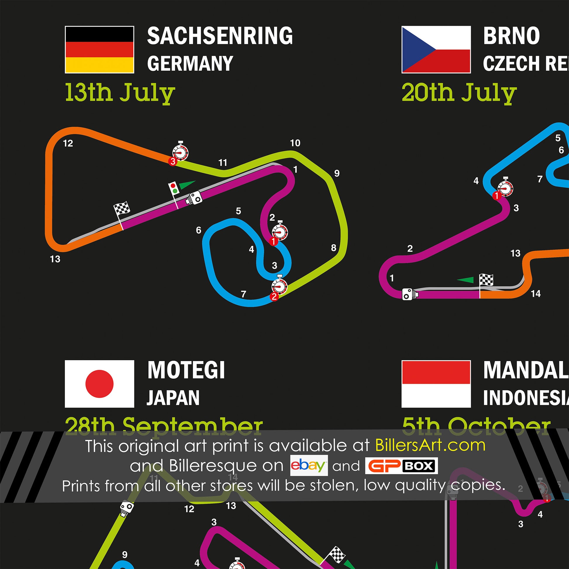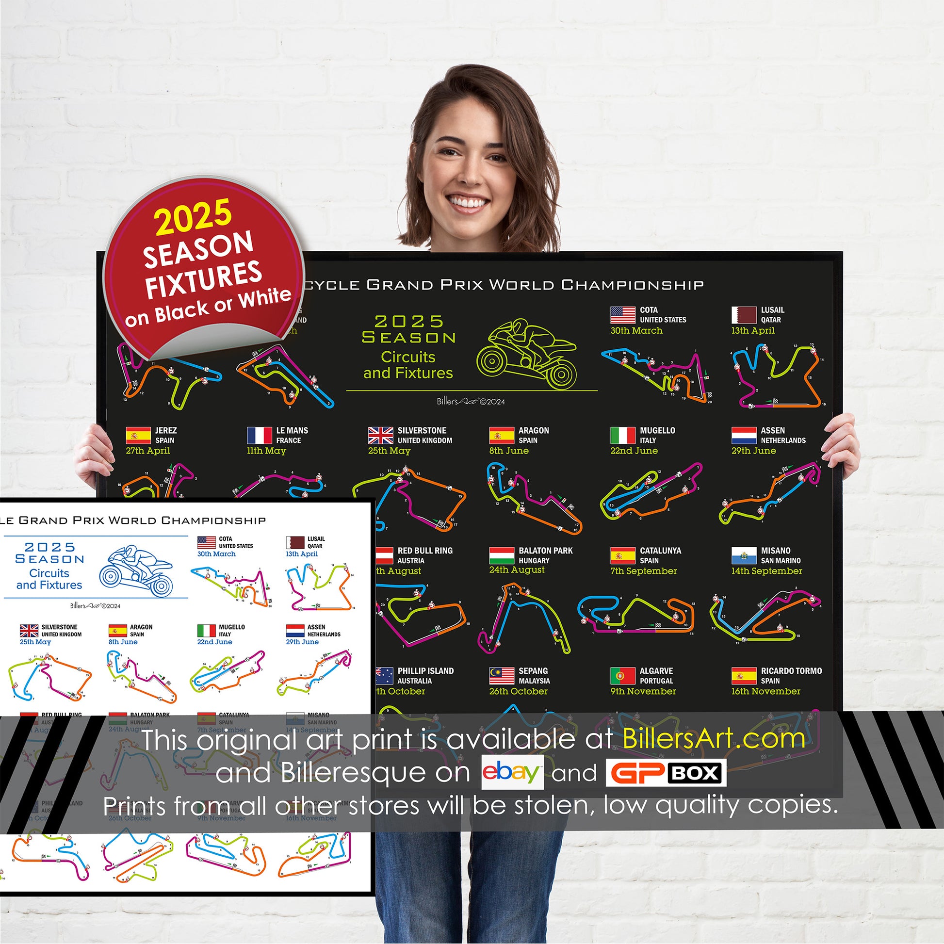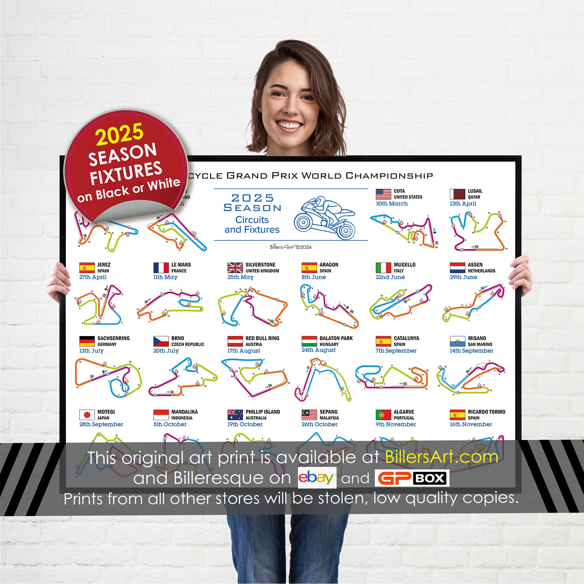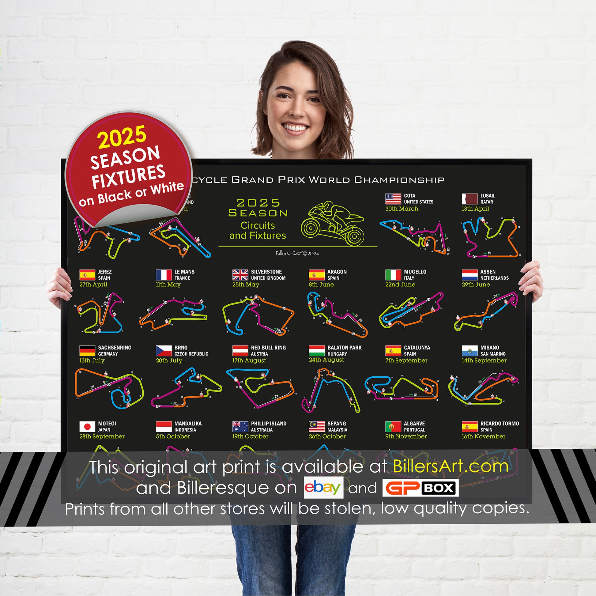 This unique colourful MotoGP poster is a perfect keepsake or gift for fans of motorcycle racing. It shows the track layout and the fixtures for all of the races in the 2025 season calendar. Choose from a black or white background.