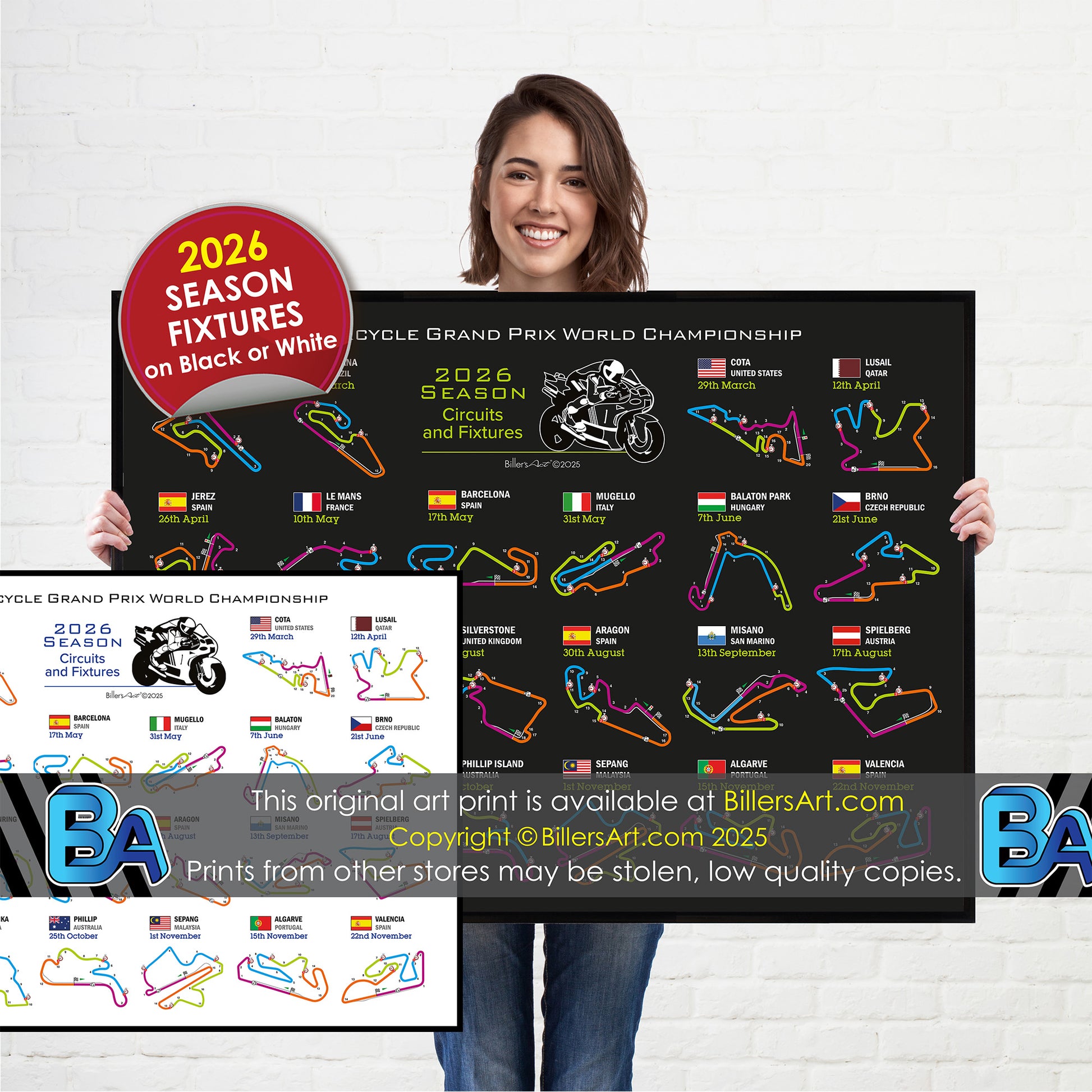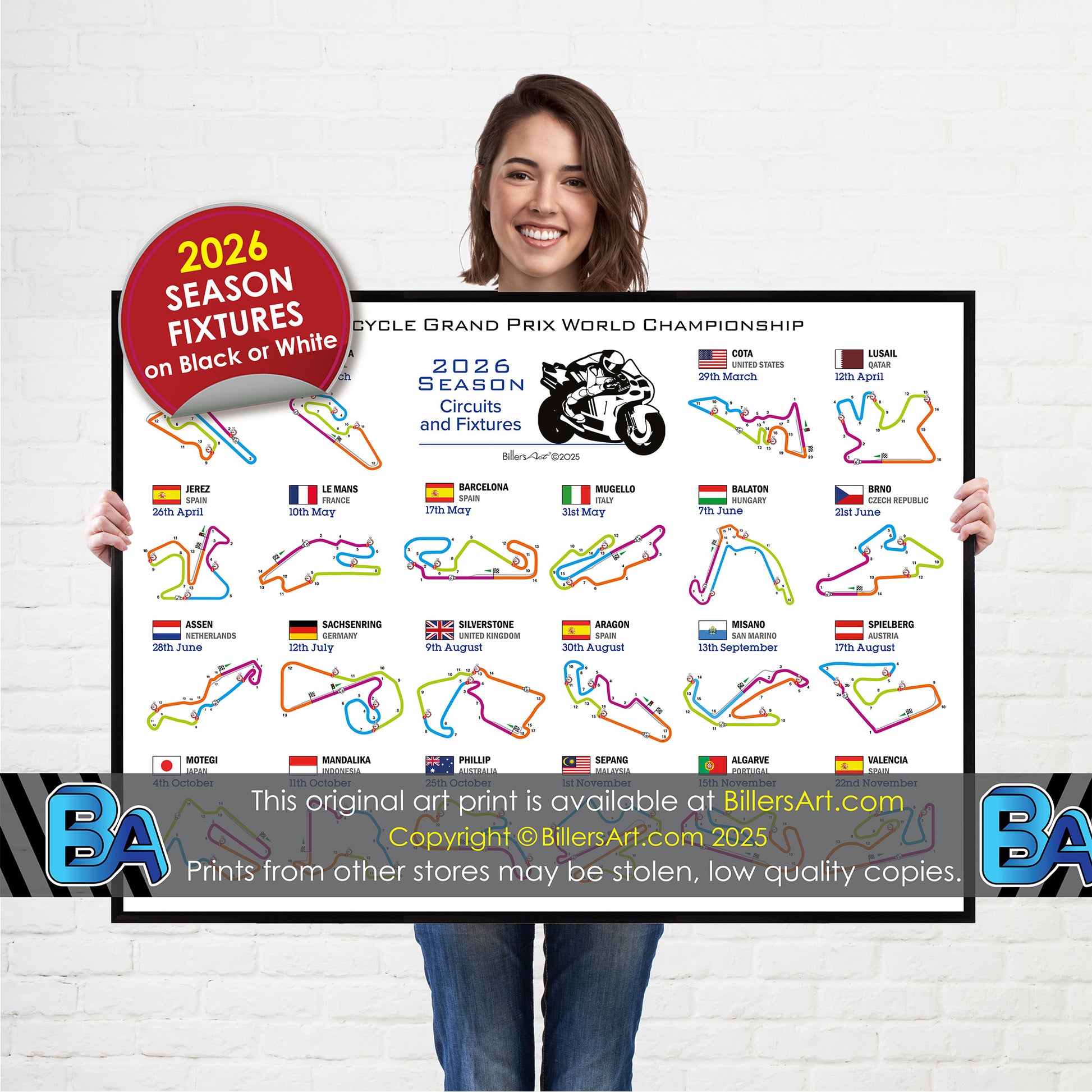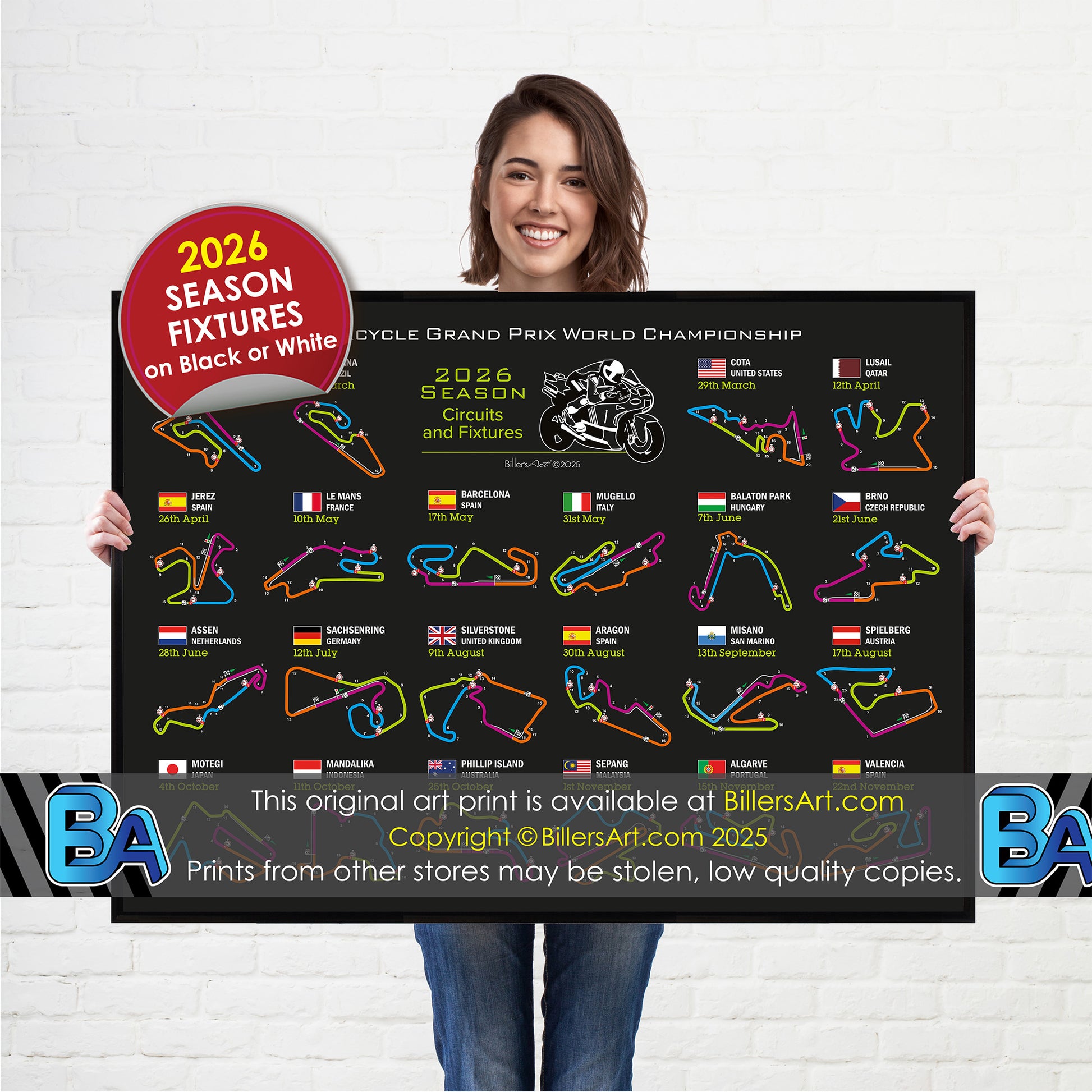 This unique colourful MotoGP poster is a perfect keepsake or gift for fans of motorcycle racing. It shows the track layout and the fixtures for all of the races in the 2026 season calendar. Choose from a black or white background.