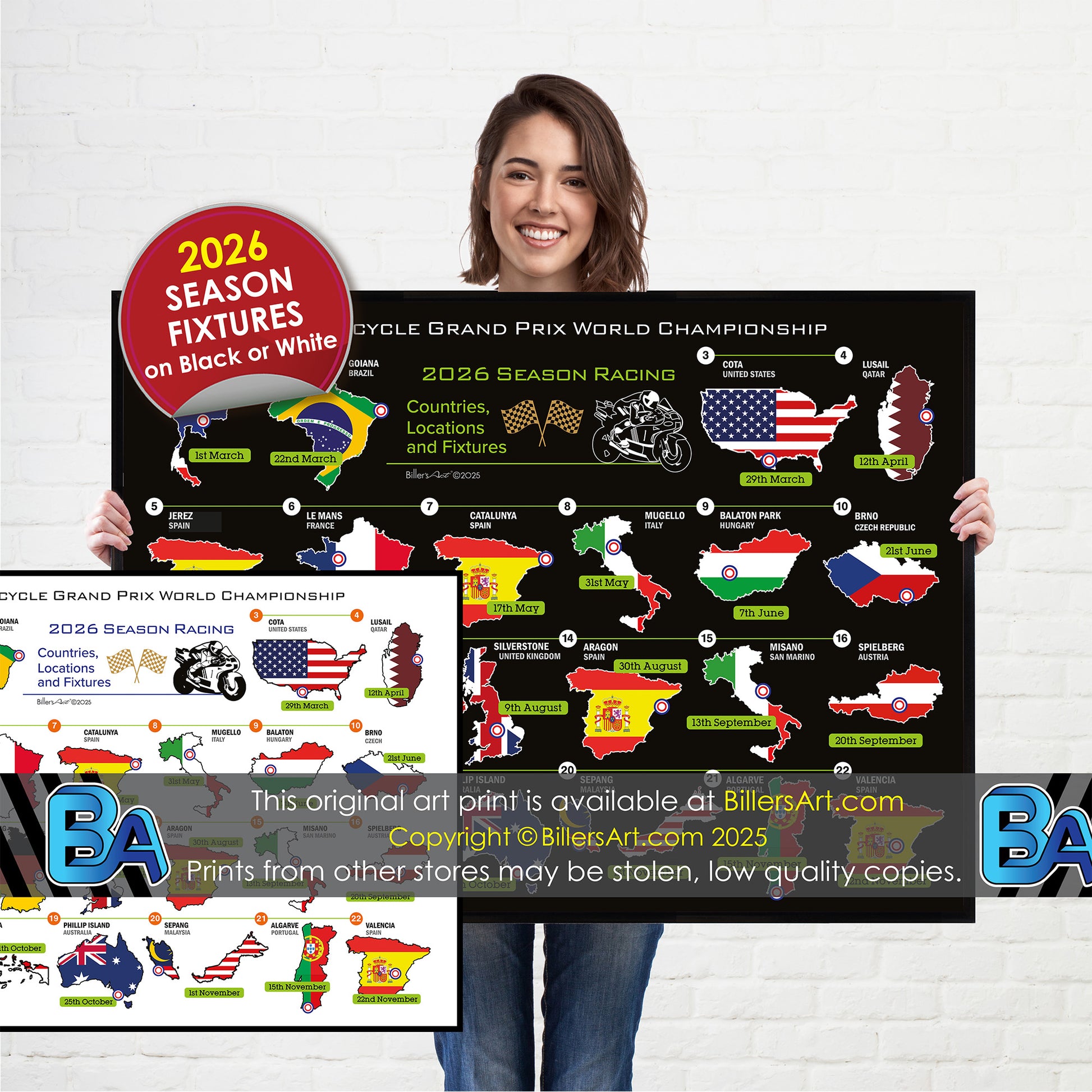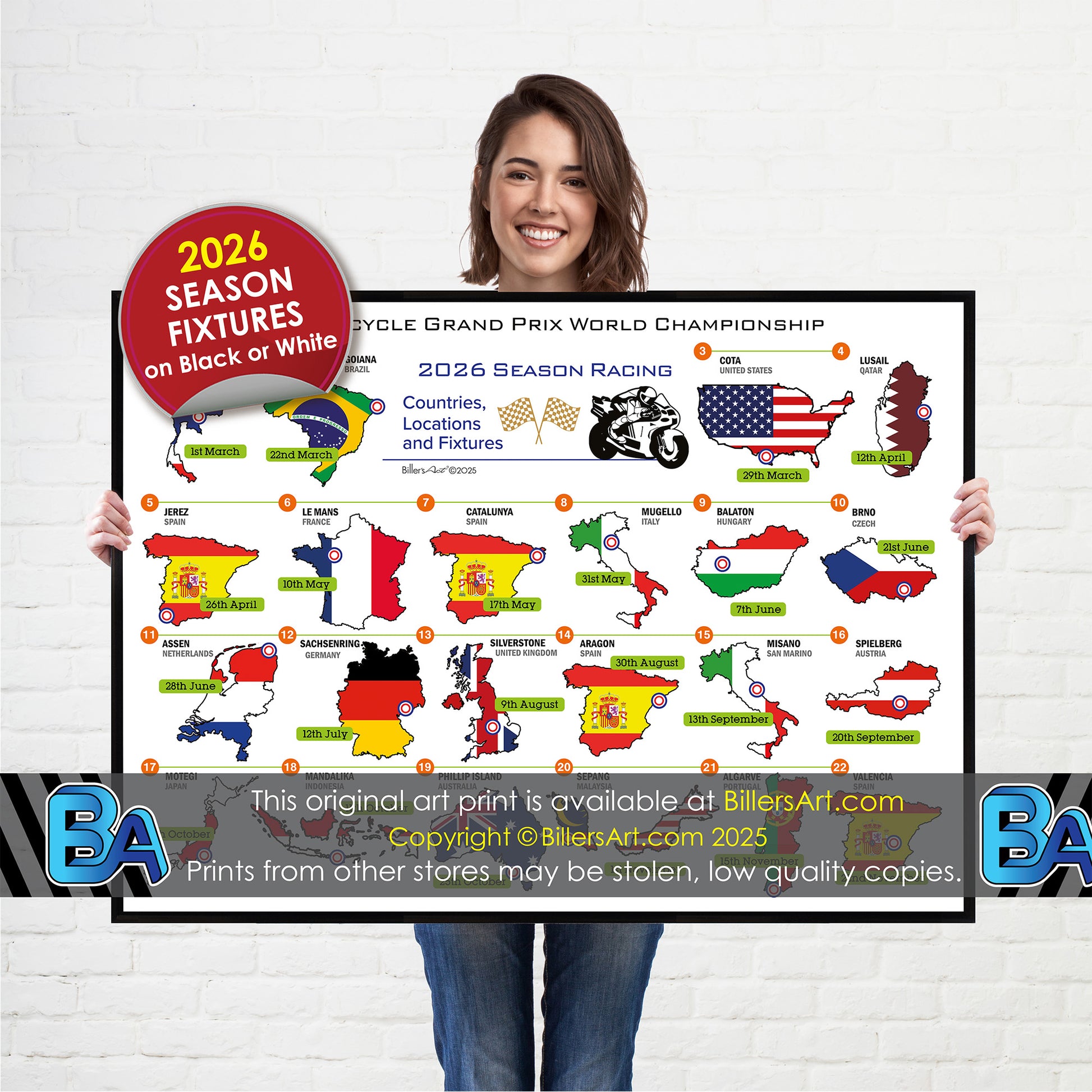 This unique colourful MotoGP poster is a perfect keepsake or gift for fans of motorcycle racing. It shows the countries (including the countries' flag), track locations and the fixtures for all of the races in the 2026 season calendar. Choose from a black or white background.